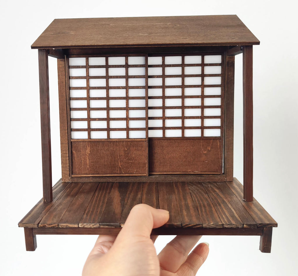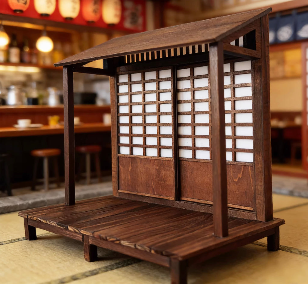 A beautifully handcrafted miniature Japanese-style dollhouse front, featuring traditional sliding shoji panels and wooden platform base. Perfect for creating realistic diorama scenes and dollhouse displays.