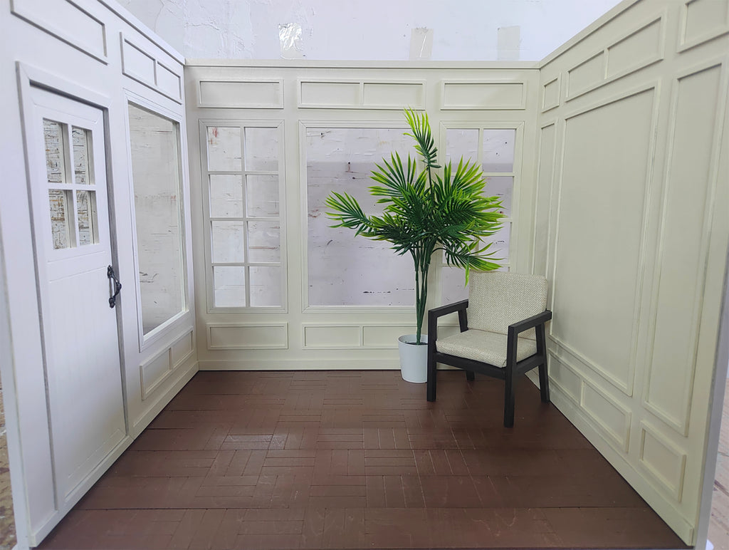 This 1:6 scale dollhouse room kit recreates a classic interior scene with wainscoting wall panels, framed windows, and a functioning door.