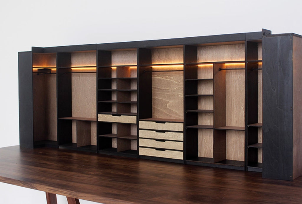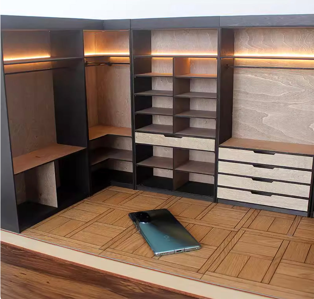 This flat-pack kit comes with pre-coloured (pre-furnished) wood panels, so no full painting is needed — only small touch-ups in a few areas using a black marker. Simply glue and assemble the panels to create your own modern walk-in wardrobe.