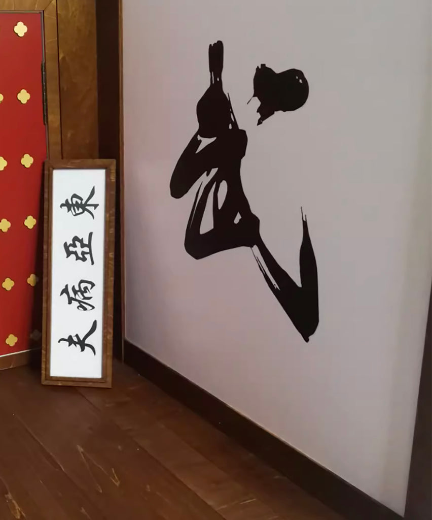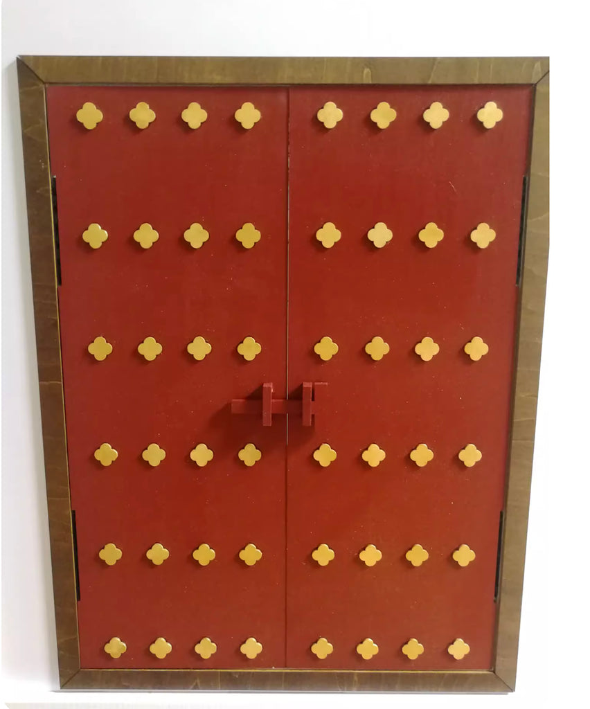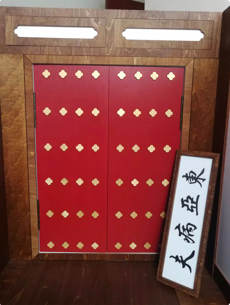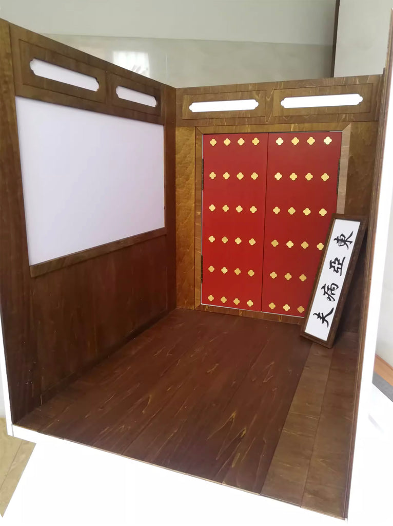 This 1:6 scale oriental-style miniature room recreates a traditional martial arts entrance hall with wood-style panels, red double doors with golden studs, and a calligraphy wall.