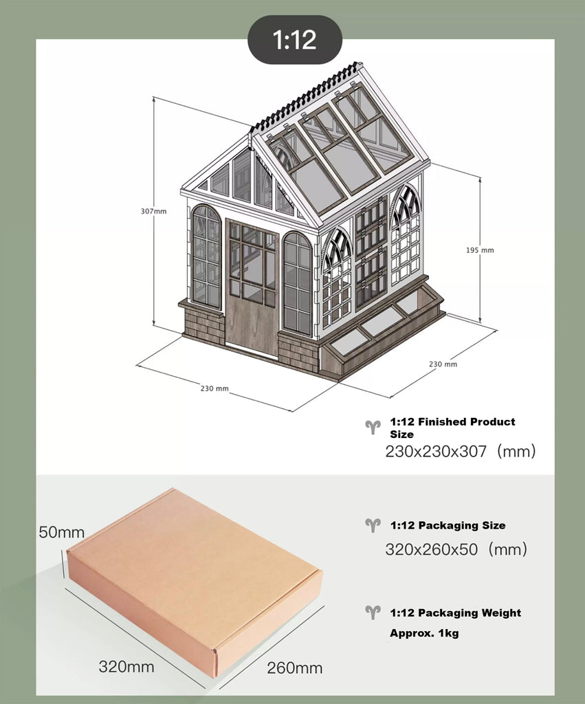 1:12 Scale – Finished size: 230 × 230 × 307 mm | Packaging: 320 × 260 × 50 mm | Weight: approx. 1 kg