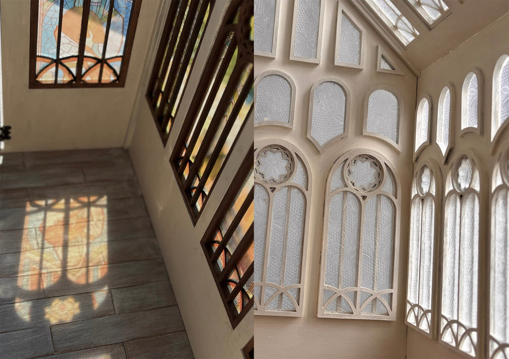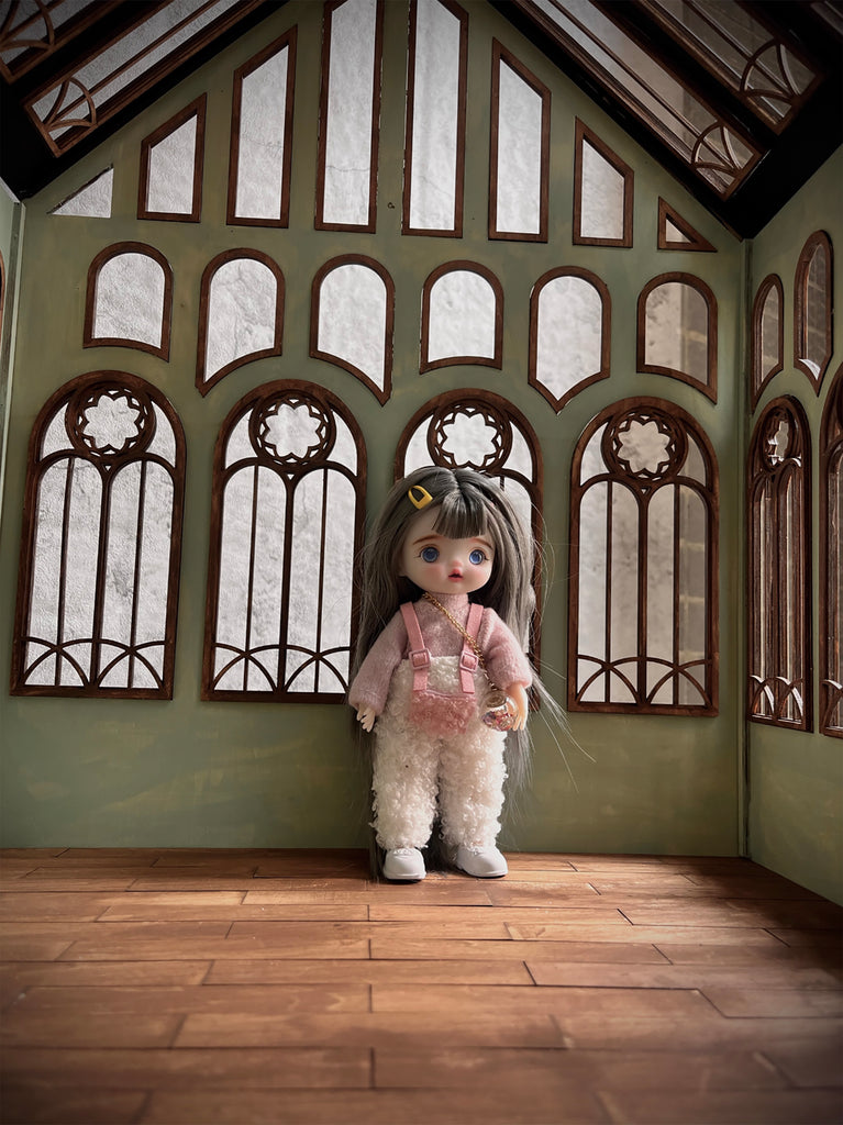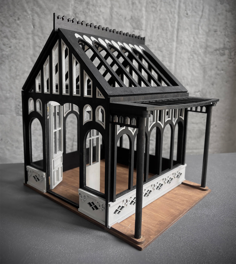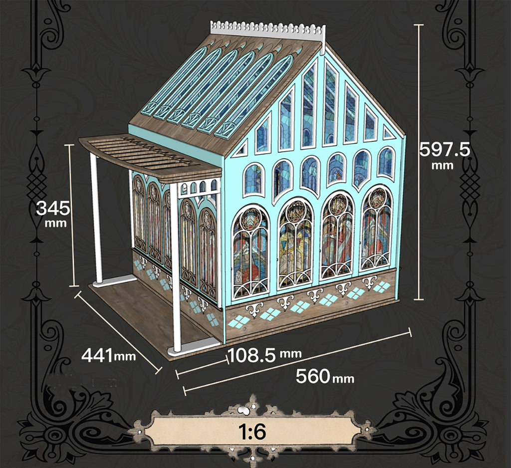 Create your own elegant miniature glasshouse with beautiful Gothic-style windows and balcony canopy. This kit comes with pre-cut wooden parts and hardware — perfect for collectors and craft lovers who enjoy building 1:6 or 1:12 scale miniature architecture.