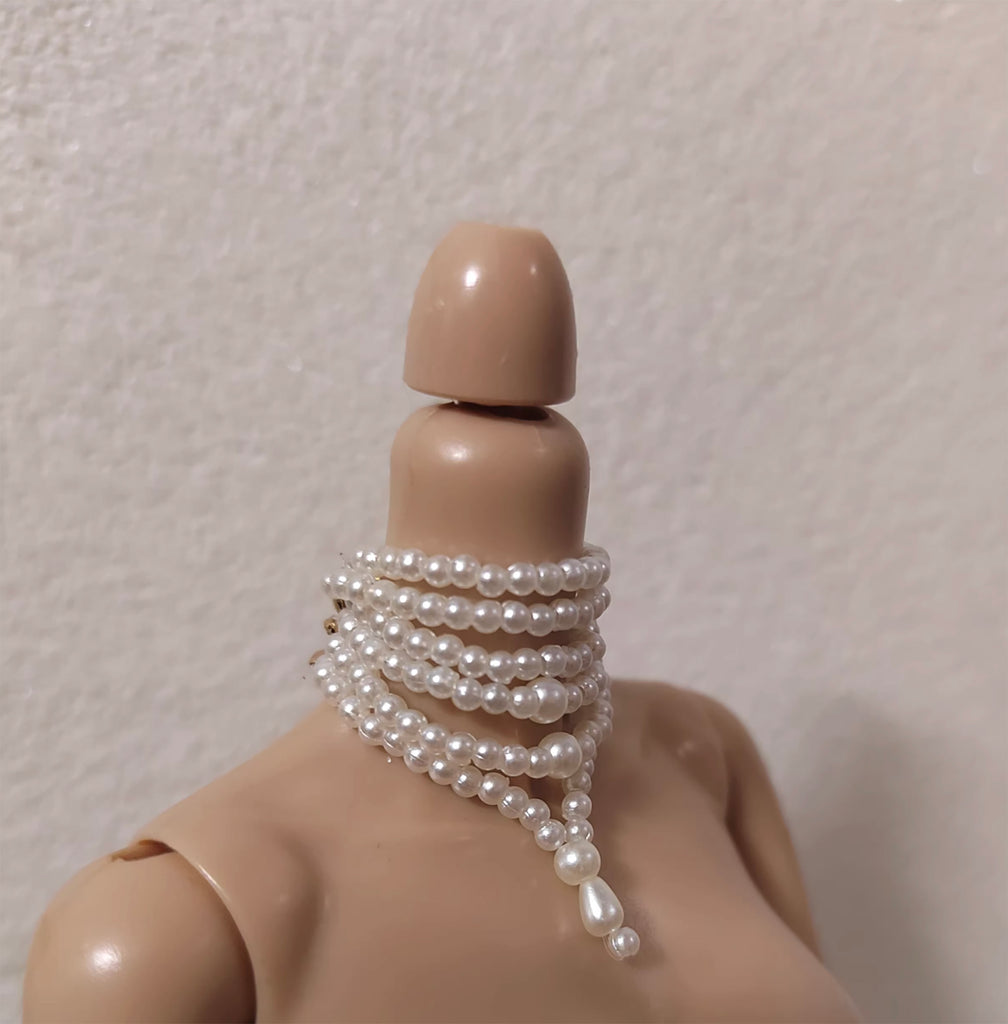 Necklace features a magnetic closure, so there is no need to remove the doll’s head.