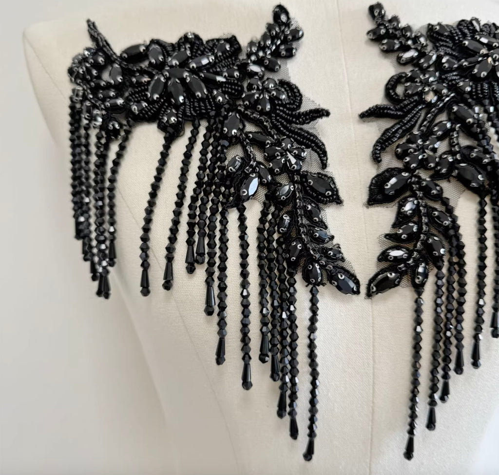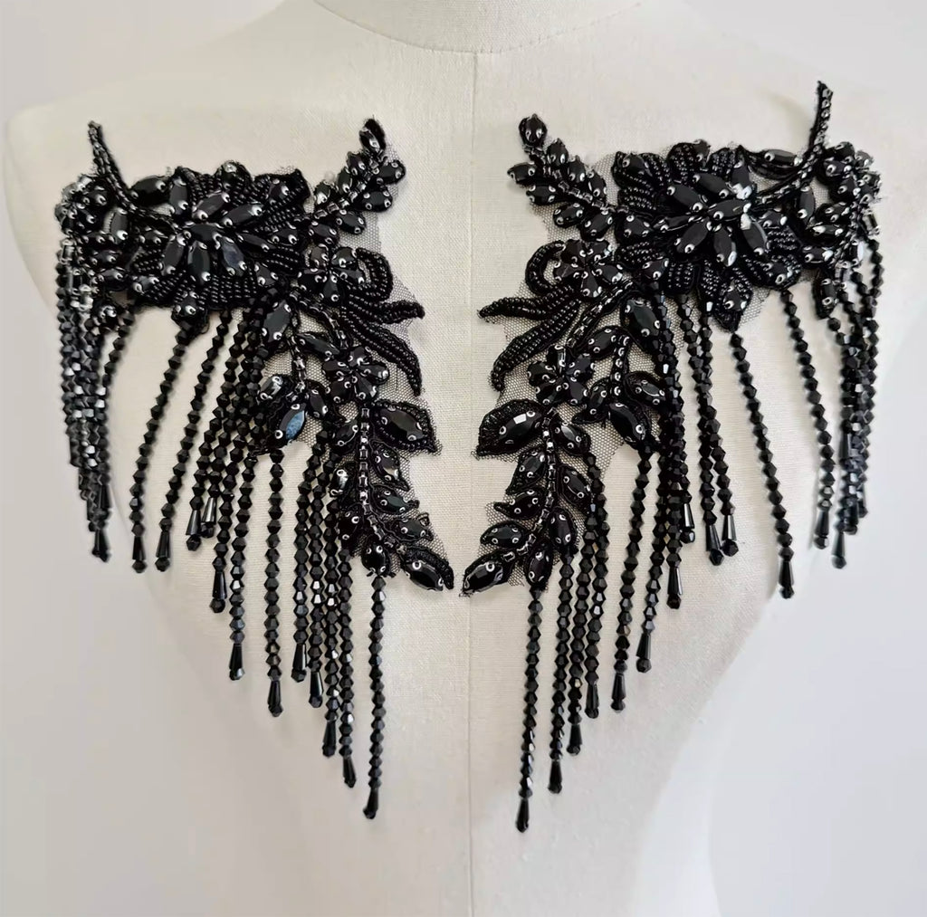 This listing is for one pair of black beaded lace appliques (left + right), designed as decorative sewing craft supplies for performance and costume embellishment.