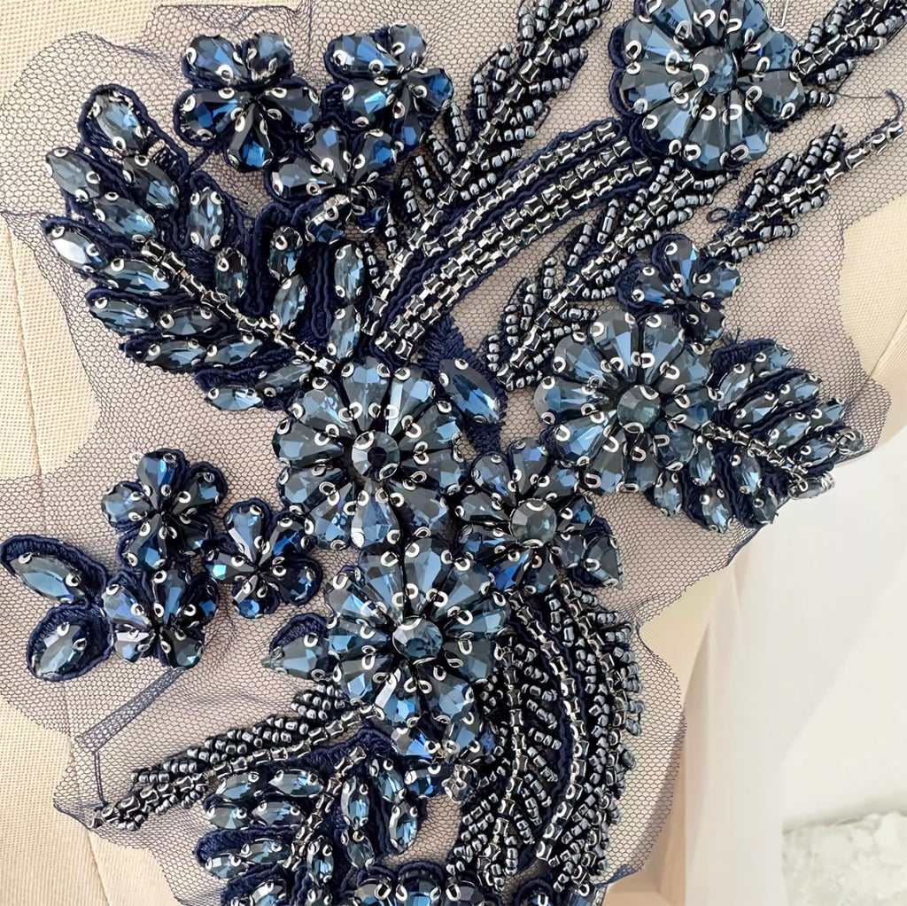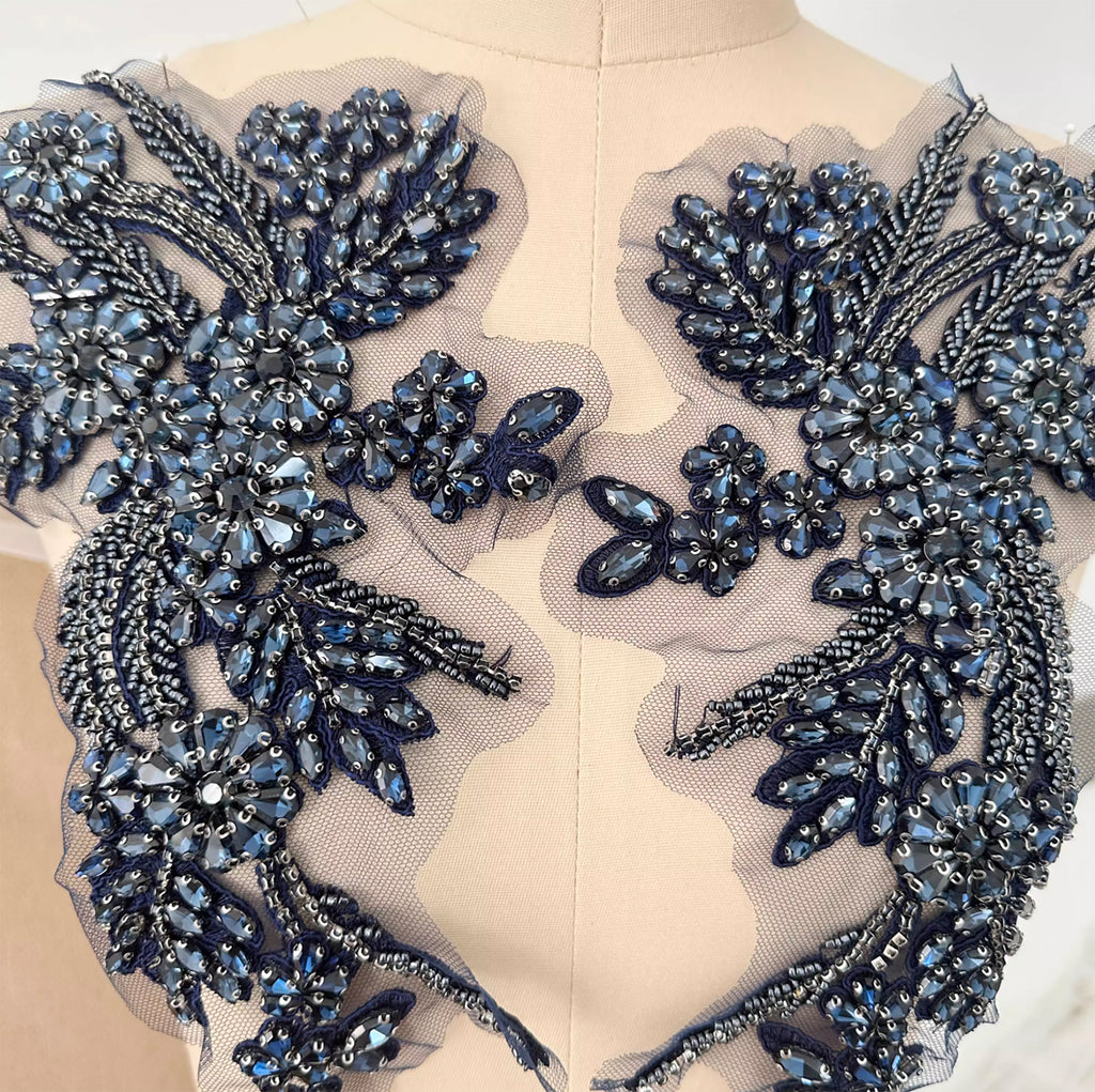 Dark Navy Blue Beaded Lace Applique Pair Floral Rhinestone Embroidery Motif Patch
