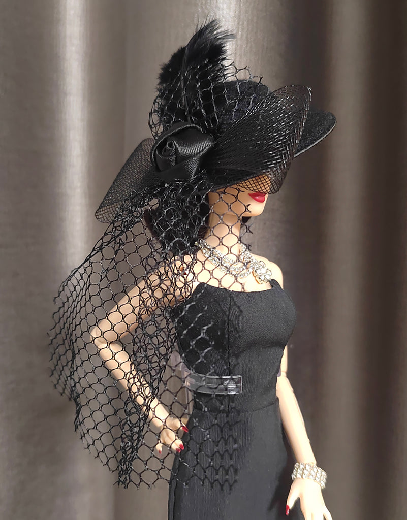 Handmade 1:6 Scale Doll Black Dress Outfit Set with Miniature Hat, Necklace & Bracelet