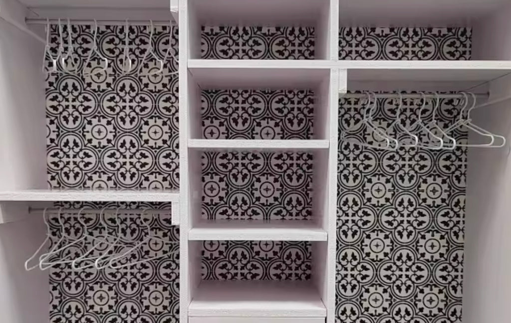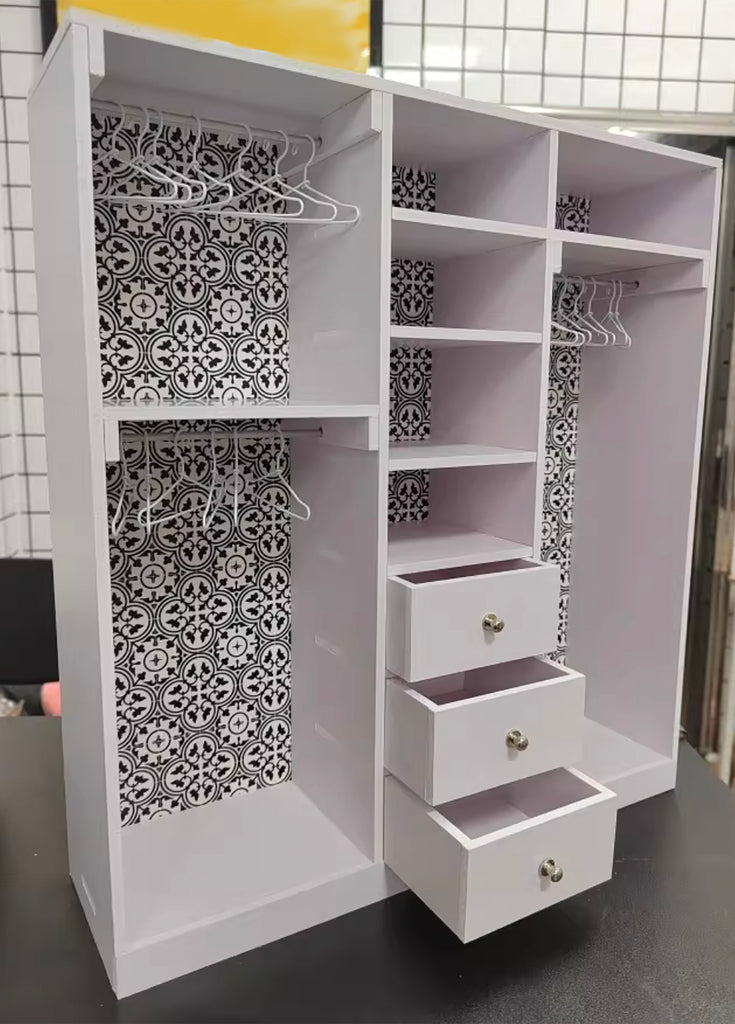 This listing is for a handmade miniature wardrobe designed for 1:6 scale dollhouses. The wardrobe features multiple hanging sections, shelves, and drawers, making it perfect for organising doll clothing and accessories.