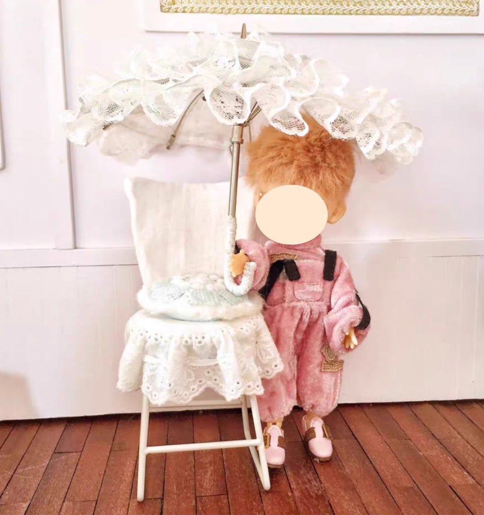 A beautifully handcrafted miniature lace parasol, designed for doll photography, display scenes, and vintage-style dioramas. Each piece is made entirely by hand, with delicate lace trimming and hand-stitched edging for an authentic, soft, romantic look.