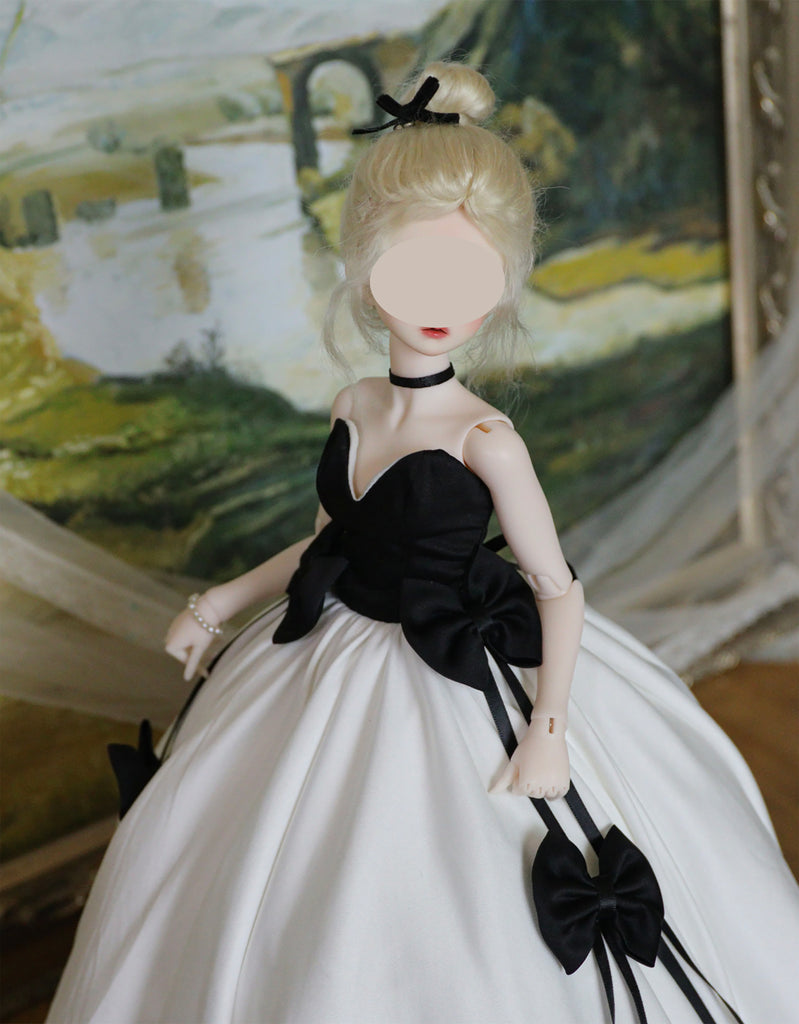 This listing is for a beautifully handcrafted doll formal gown featuring a classic black-and-white design with a full layered petticoat. Each piece is carefully made for collectors who love elegant couture-style doll fashion.