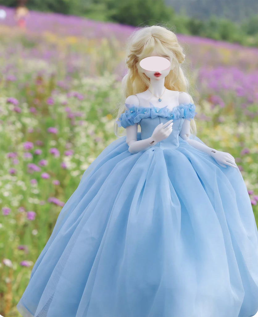 This listing is for a beautifully handcrafted miniature doll ball gown in a soft sky blue fairytale style, paired with a full layered tulle petticoat for elegant volume and shape.