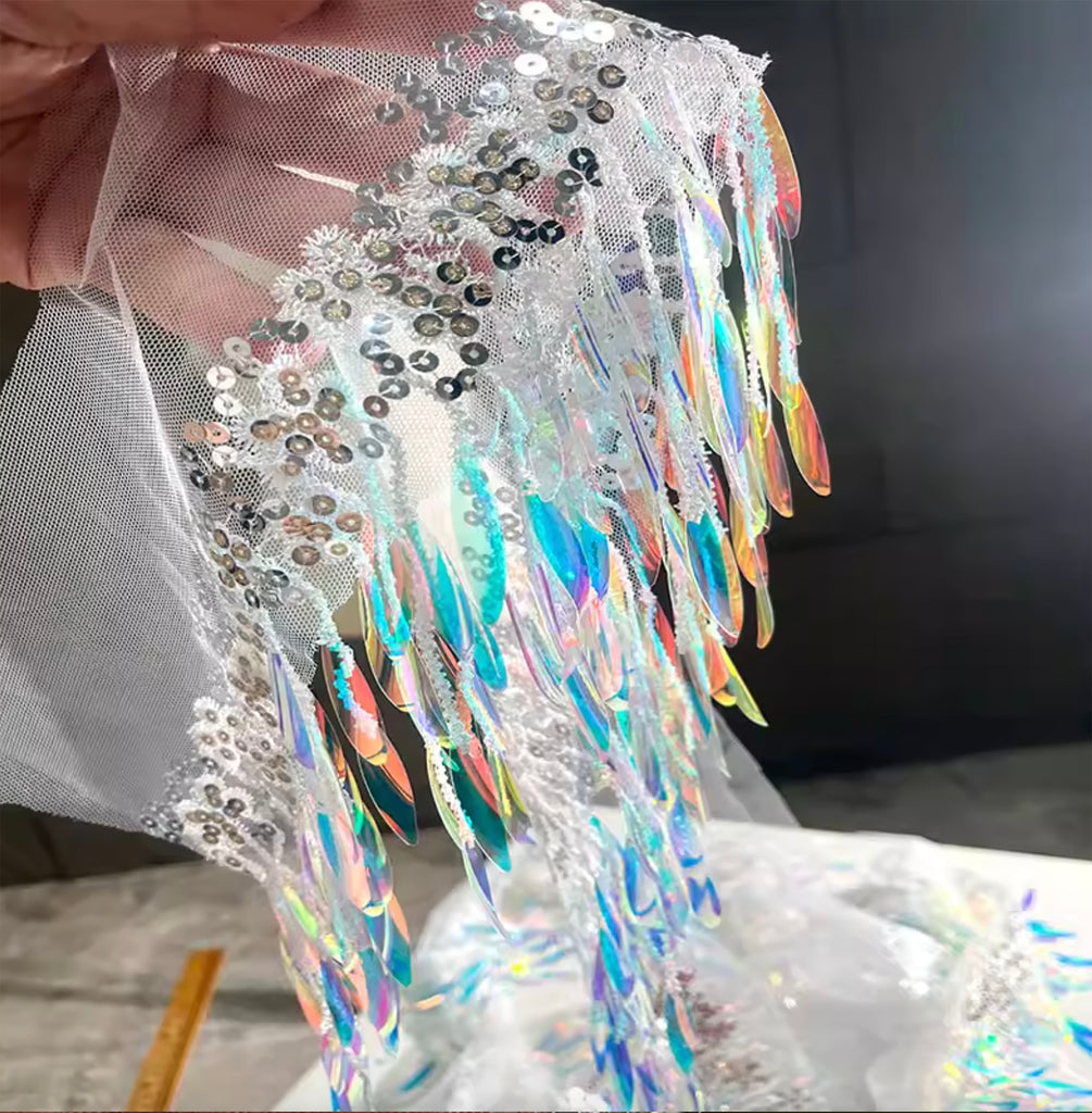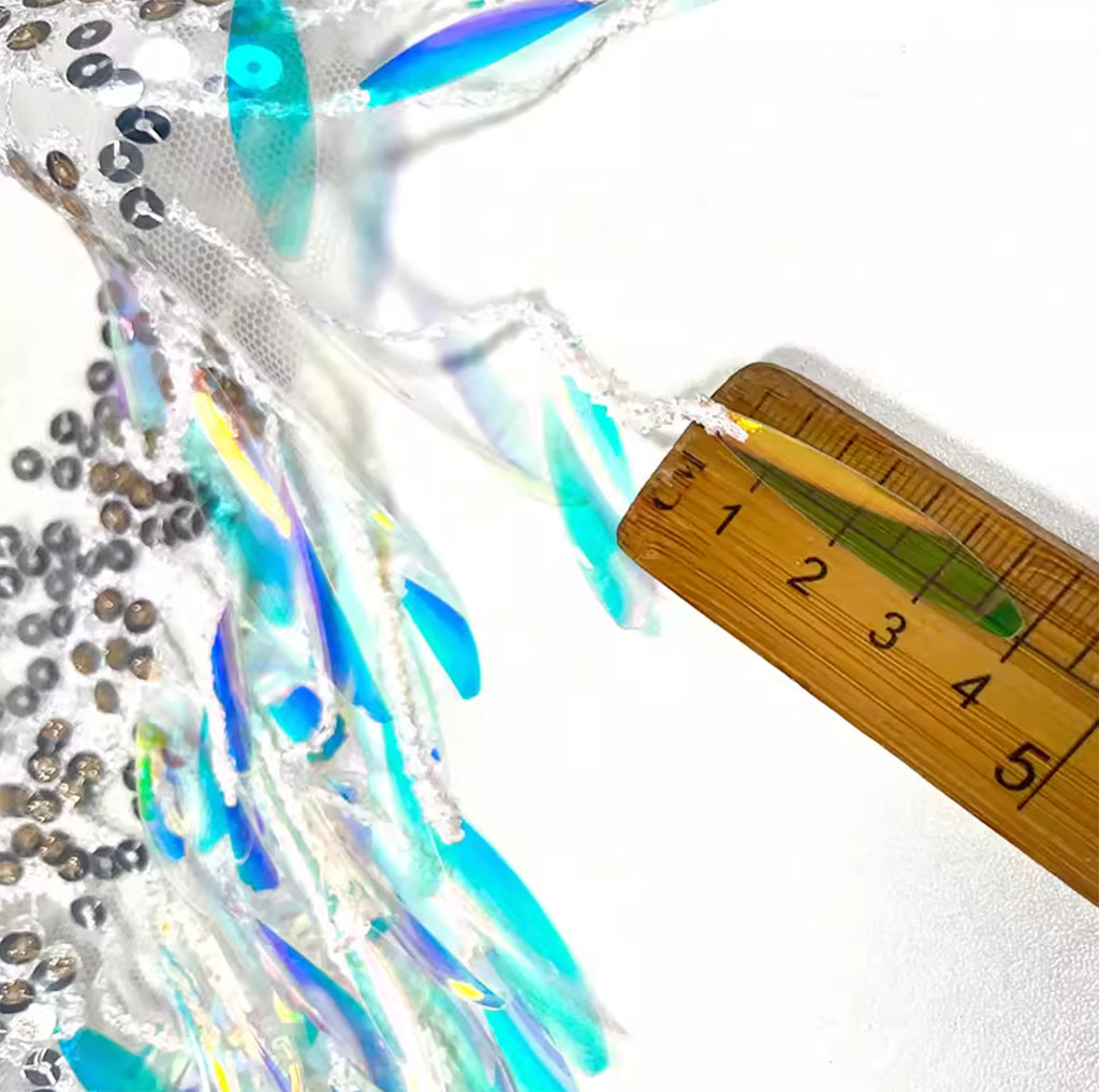 The trim features shimmering holographic sequins and flowing fringe details attached to a soft mesh base. The colour transitions in a beautiful gradient blue tone, creating a striking reflective effect under light.