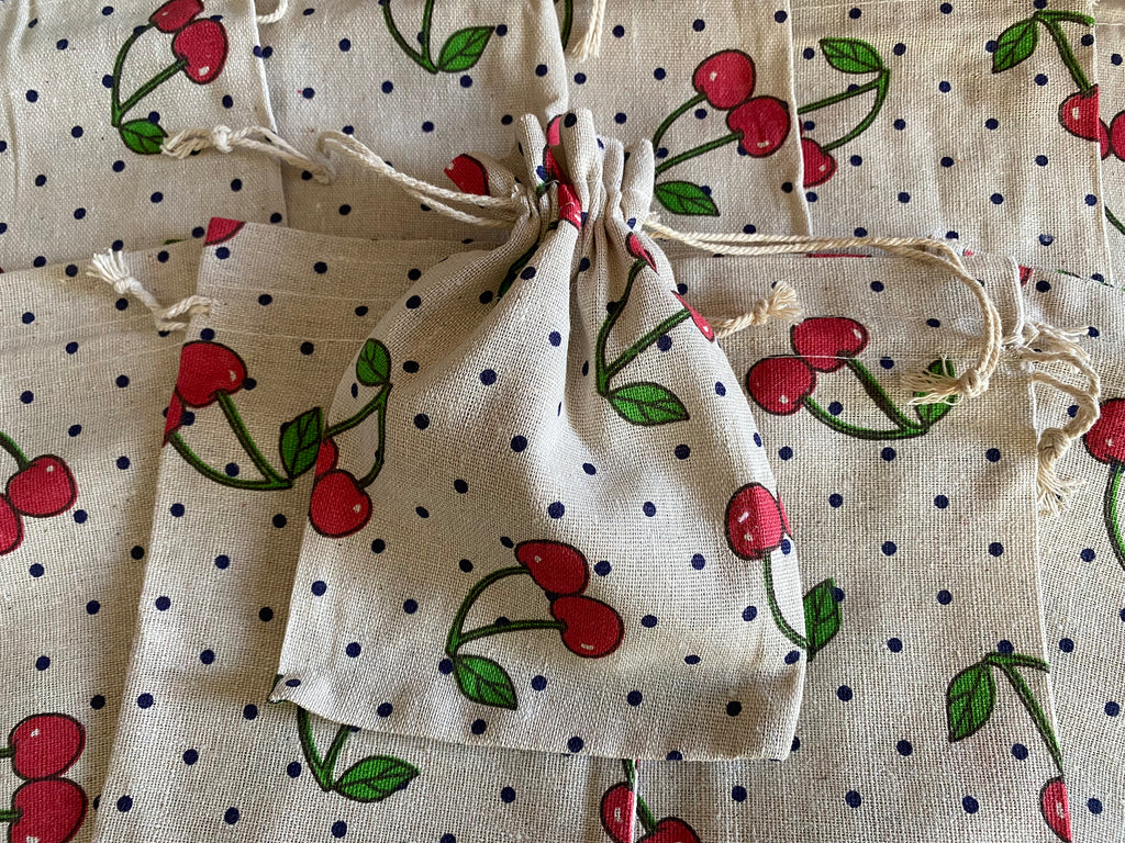 Bundle 10pcs Cherry and Polka Dot Print Drawstring Gift Bags Natural Linen Pouch Bag is for sale.